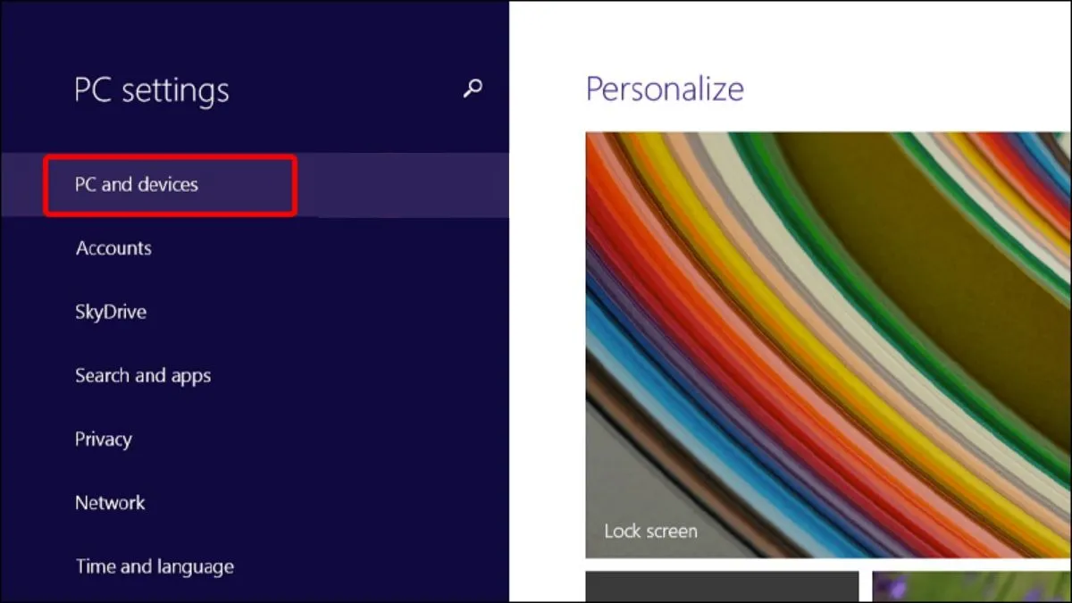 Trong cửa sổ PC settings, hãy chọn PC and devices để tìm kiếm các tùy chọn liên quan đến thiết bị. Đây là nơi tập trung các cài đặt về màn hình, thiết bị ngoại vi và Bluetooth.