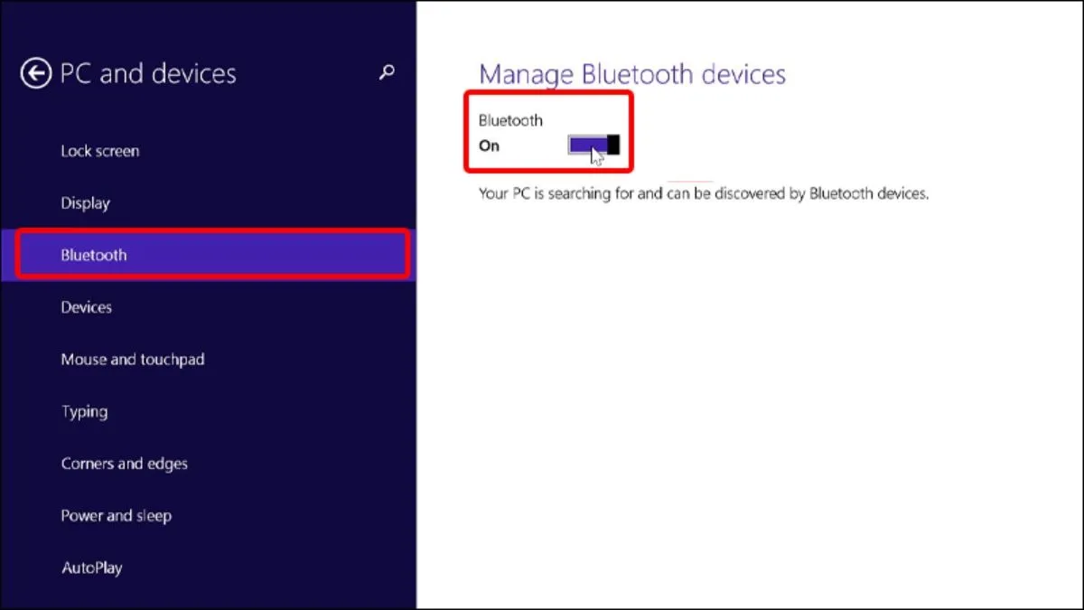 Cuối cùng, trong tab Bluetooth, bạn chỉ cần gạt công tắc Bluetooth sang vị trí On. Windows 8/8.1 sẽ tự động tìm kiếm các thiết bị Bluetooth khả dụng trong phạm vi kết nối.