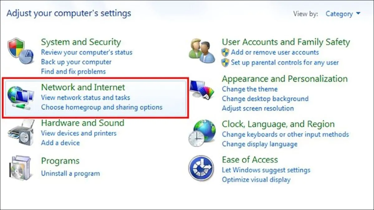Chọn Network and Internet trong Control Panel Win 7Chọn Network and Internet trong Control Panel Win 7