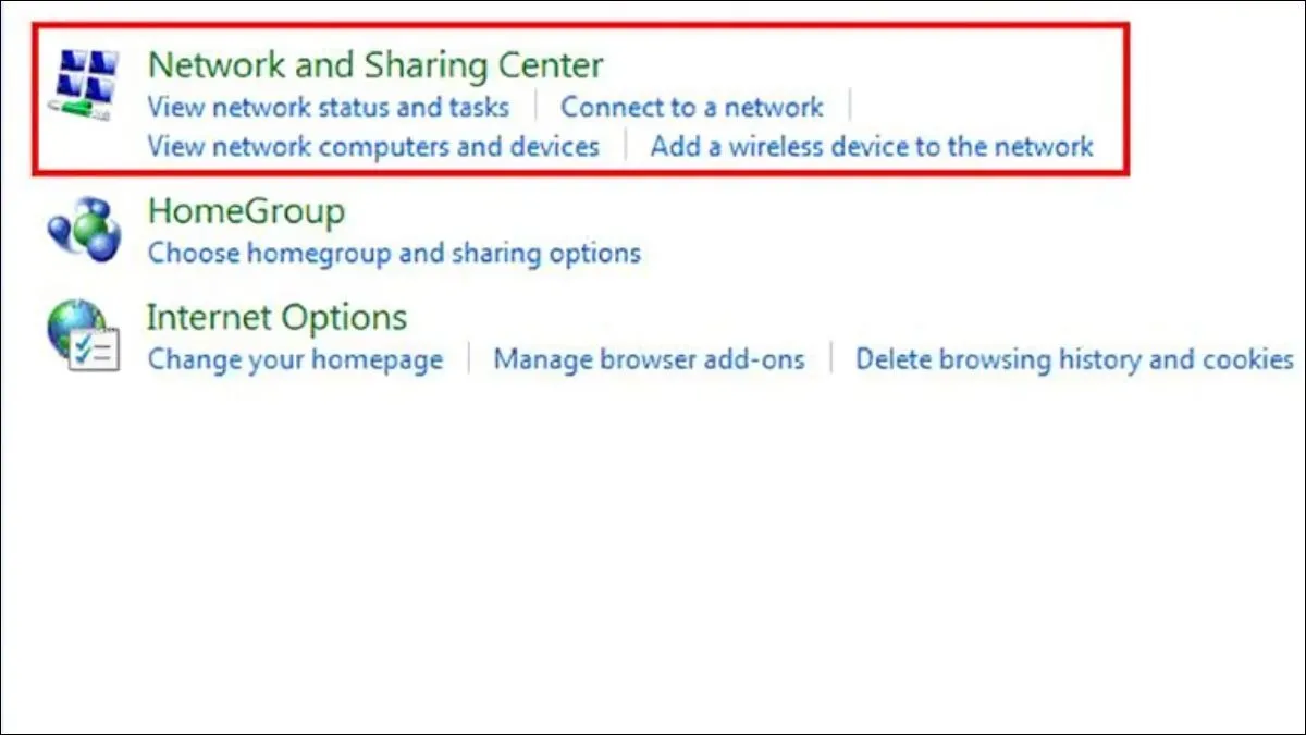 Tiếp theo, chọn Network and Sharing Center để đi sâu vào các tùy chọn chia sẻ và quản lý kết nối. Đây là trung tâm để tùy chỉnh các adapter mạng.