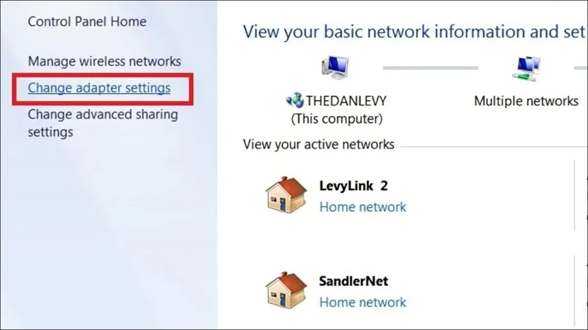 Sau đó, bạn nhấp chuột chọn Change adapter settings nằm ở bên trái cửa sổ. Thao tác này sẽ hiển thị danh sách tất cả các card mạng đã được cài đặt.