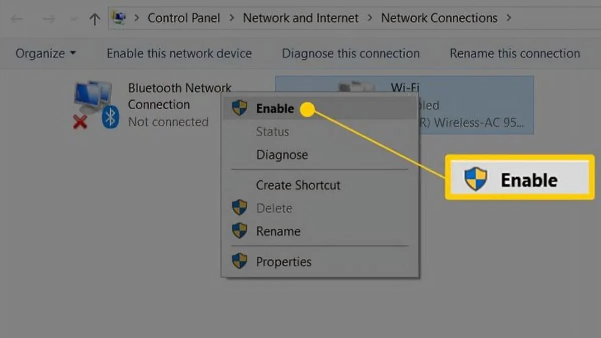 Trong danh sách, bạn tìm đến Bluetooth Network Connection, sau đó nhấp chuột phải. Cuối cùng, chọn Enable để bật Bluetooth, hoặc Disable để tắt khi không sử dụng.