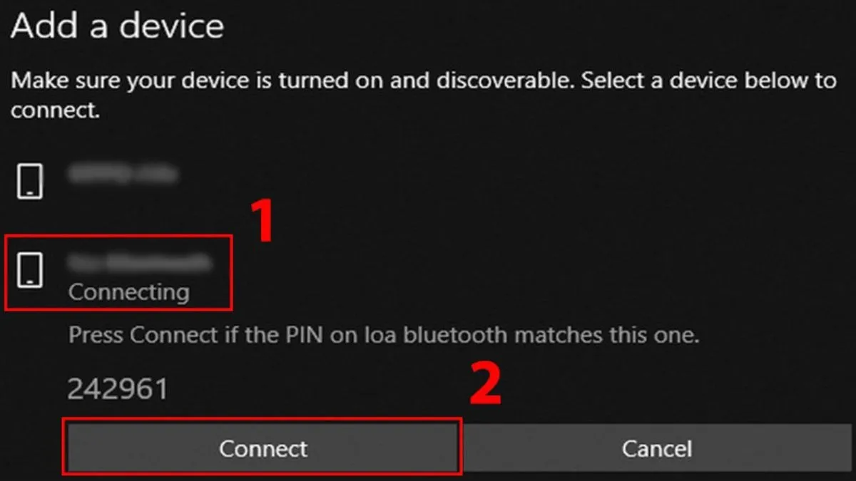 Quá trình này có thể yêu cầu bạn xác nhận một mã PIN trên cả hai thiết bị (thường là 0000). Sau khi ghép nối thành công, tên loa sẽ hiển thị trạng thái Connected.