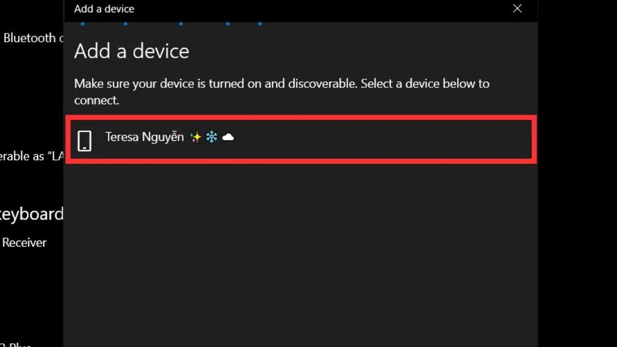 Trên laptop, bạn chọn Add Bluetooth or other device và tìm tên điện thoại của bạn từ danh sách. Sau đó, bạn chọn tên điện thoại để bắt đầu quá trình ghép nối.