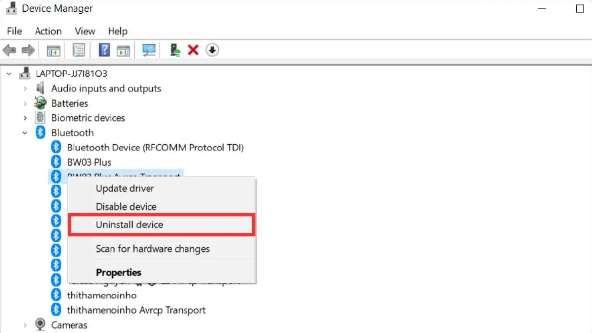 Nếu cập nhật driver không giải quyết được lỗi, bạn hãy thử gỡ cài đặt driver Bluetooth hiện tại. Vẫn trong Device Manager, click chuột phải và chọn Uninstall device.