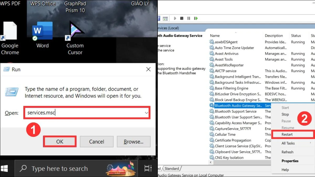 Dịch vụ hỗ trợ Bluetooth (Bluetooth Support Service) là tiến trình nền quan trọng. Bạn mở Services bằng cách nhấn Windows + R, gõ services.msc rồi Enter.