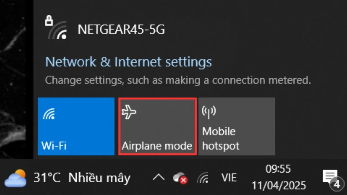 Một mẹo nhỏ là thử tắt/bật chế độ Máy bay (Airplane mode) trên laptop Dell của bạn. Chế độ này sẽ tắt tất cả kết nối không dây, và việc bật lại có thể giải quyết xung đột mạng.