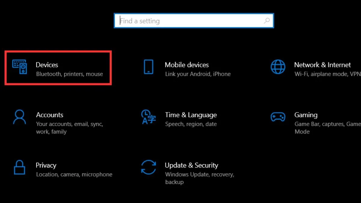 Trong cửa sổ Settings, bạn hãy nhấn chọn mục Devices để truy cập cài đặt các thiết bị phần cứng. Mục này quản lý chuột, bàn phím, máy in và Bluetooth.