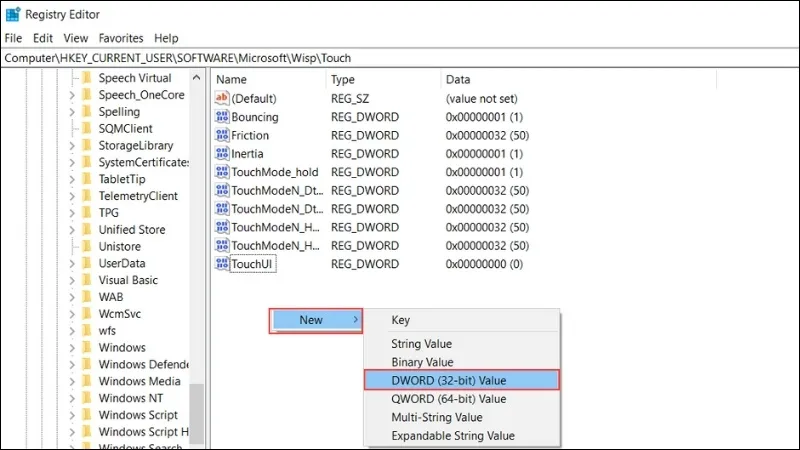 Nếu khóa Touch chưa tồn tại, bạn cần phải tạo nó. Sau khi đã ở đúng đường dẫn, bạn sẽ tạo một giá trị DWORD mới: