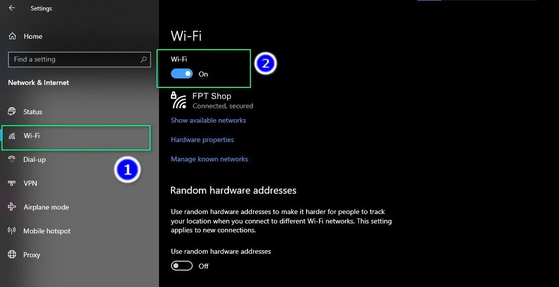 Trong cửa sổ Network & Internet, chọn “Wi-Fi”. Gạt công tắc trạng thái (Toggle Switch) của Wi-Fi từ Off sang On.