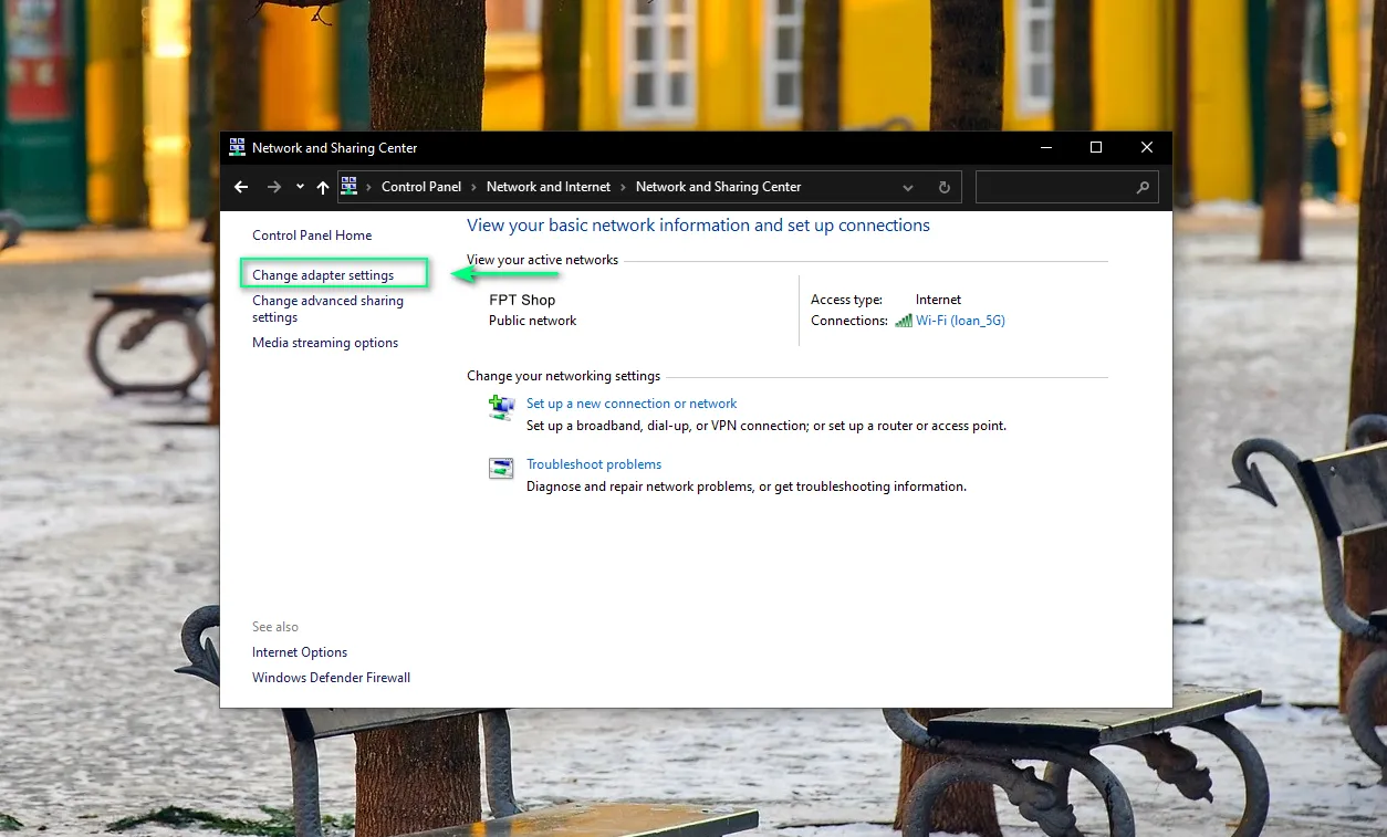 Thao tác chọn 'Change adapter settings' trong Network and Sharing Center