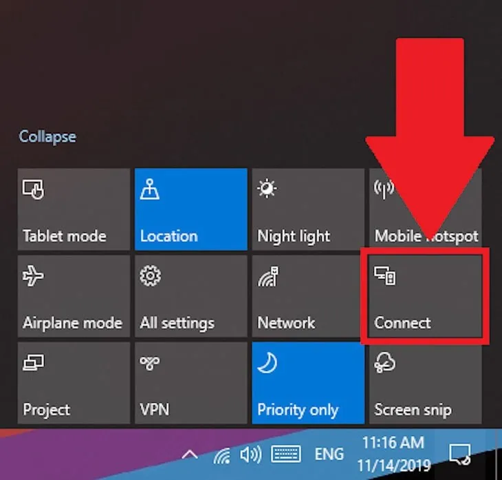 Tiếp theo, bạn nhấn chọn vào mục “Connect” trong cửa sổ Action Center vừa bật. Thao tác này sẽ hiển thị các tùy chọn kết nối không dây. Nếu không thấy, hãy nhấn vào “Expand” để mở rộng các ô tùy chọn.