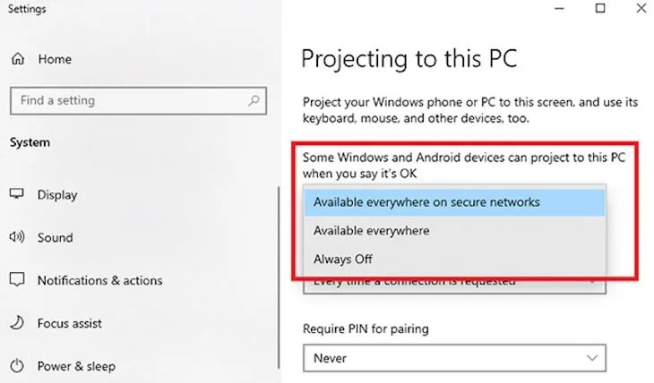 Tại mục “Some Windows and Android devices…”, bạn cần đảm bảo rằng laptop đang ở chế độ sẵn sàng nhận kết nối. Nếu đang ở “Always Off“, hãy chuyển thành “Available everywhere on secure networks” hoặc “Available everywhere” tùy thuộc nhu cầu bảo mật mạng bạn đang sử dụng. Việc chọn “secure networks” là khuyến nghị tốt nhất cho môi trường doanh nghiệp.