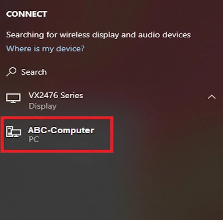 Bạn hãy mở “Action Center” trên PC (tương tự như bước 1) và chọn “Connect“. Bạn sẽ thấy tên laptop của mình hiển thị trong danh sách các thiết bị có thể kết nối không dây. Nhấn chuột vào tên thiết bị đó.