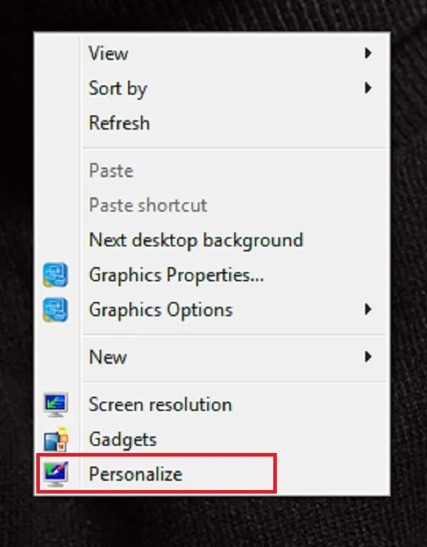 Đầu tiên, người dùng cần nhấp chuột phải vào một vùng trống trên màn hình desktop. Chọn Personalize từ menu ngữ cảnh để mở cửa sổ cài đặt giao diện. Thao tác này cho phép truy cập các tùy chỉnh liên quan đến hiển thị và bảo vệ màn hình.