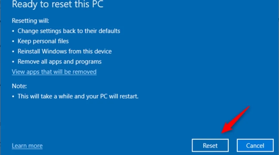 Lựa chọn phương thức cài lại hệ điều hành Win 10 - Xác nhận Cuối cùng: Nhấn Reset và chờ đợi quá trình khôi phục cài đặt gốc hoàn tất.
