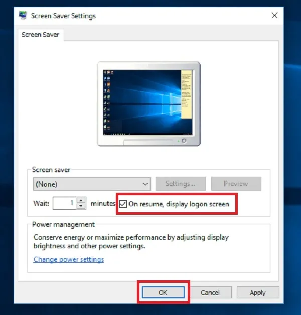 Trong hộp thoại Screen Saver Settings, bạn cần tìm ô kiểm tra có nhãn On resume, display logon screen (Khi tiếp tục, hiển thị màn hình đăng nhập). Bắt buộc phải đánh dấu chọn vào ô này để kích hoạt tính năng khóa màn hình.