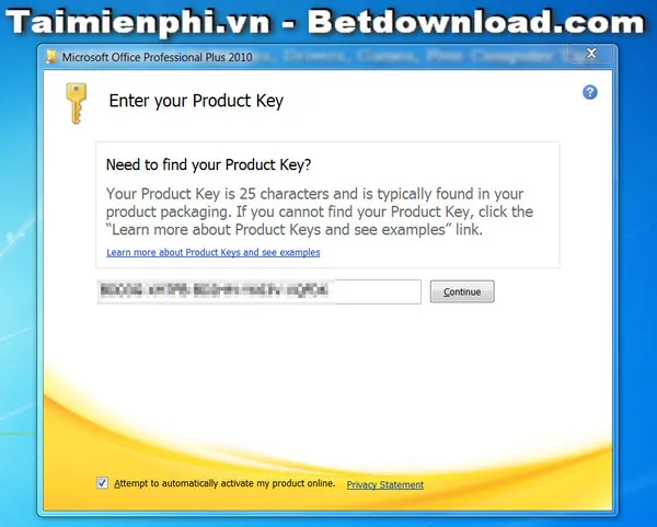 Khi chạy trình cài đặt, bạn sẽ được yêu cầu nhập Khóa Sản Phẩm gồm 25 ký tự. Nhập chính xác khóa sản phẩm này là bước bắt buộc để xác minh quyền sở hữu và kích hoạt phần mềm. Nếu không nhập, bạn chỉ có thể cài đặt bản dùng thử có giới hạn thời gian.