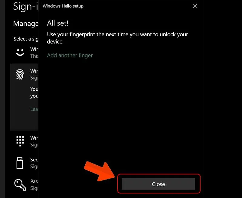 Khi quét hoàn tất, bạn có thể chọn Add another finger (Thêm ngón tay khác) hoặc nhấp Close (Đóng) để kết thúc quá trình. Vân tay của bạn hiện đã được thiết lập để đăng nhập.