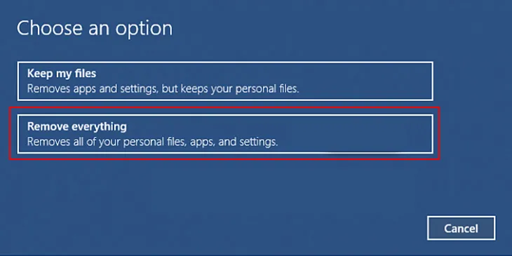 Remove everything: Tùy chọn này sẽ xóa sạch tất cả mọi thứ, bao gồm ứng dụng, cài đặt và tệp cá nhân. Đây là lựa chọn lý tưởng khi muốn bán, tặng máy hoặc muốn một hệ thống sạch hoàn toàn như mới.