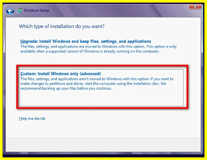 - Chọn Loại Cài đặt: Chọn Custom: Install Windows only (advanced).