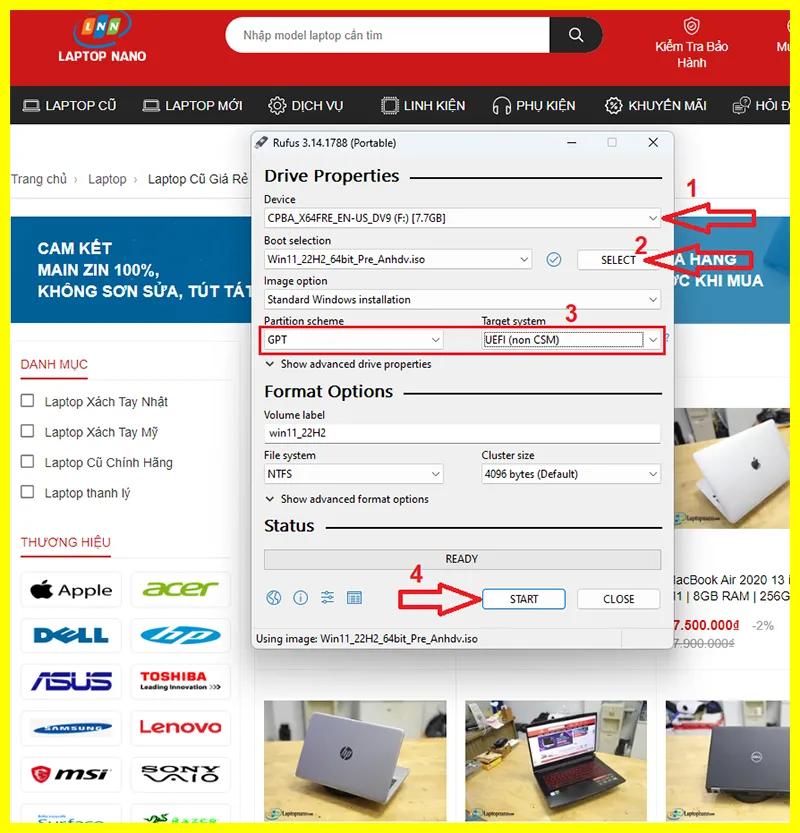 .ISOWindows 11 (64-bit) và công cụ Rufus phiên bản mới nhất. - Cấu Hình Rufus: Mở Rufus, cắm USB vào máy.