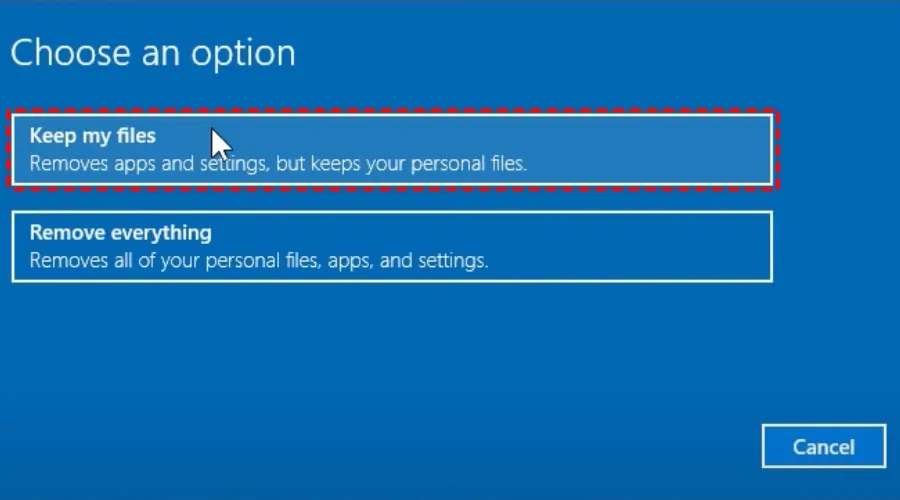 4. Tại màn hình tùy chọn, chọn Keep my files (Xóa ứng dụng và thiết lập, nhưng giữ lại tệp cá nhân).Chọn Keep my files để giữ lại dữ liệu cá nhânChọn Keep my files để giữ lại dữ liệu cá nhân