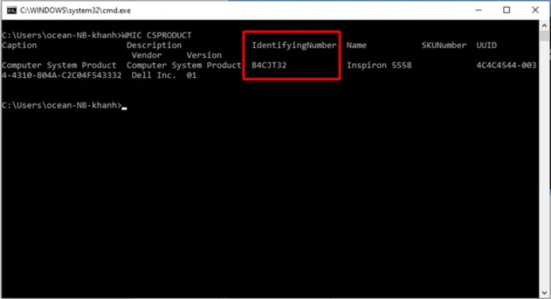 WMIC CSPRODUCT GET IdentifyingNumbervà nhấn Enter. - Kết quả hiển thị tại mục IdentifyingNumber chính là Service Tag của máy.