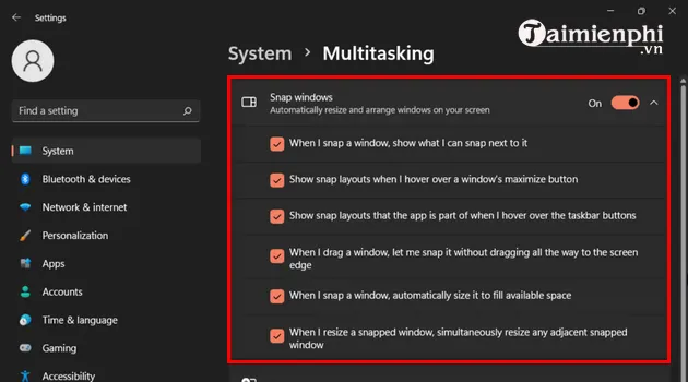 Cách khắc phục đơn giản là quay lại đường dẫn Settings > System > Multitasking và kiểm tra trạng thái. Đảm bảo tất cả các tùy chọn con bên dưới (như hiển thị bố cục khi di chuột) cũng được bật để có trải nghiệm đầy đủ. Nếu đã bật mà vẫn không hoạt động, hãy thử khởi động lại máy tính.