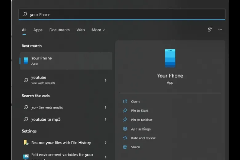 Tìm kiếm ứng dụng Phone Link trên máy tính Windows để bắt đầu quá trình kết nối với điện thoại Android