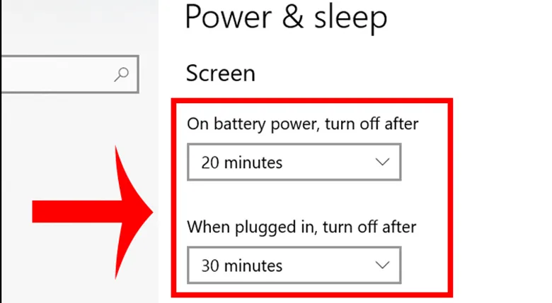 Screen(Màn hình), bạn sẽ thấy hai tùy chọn chính để điều chỉnh thời gian chờ trước khi màn hình tắt:On battery power, turn off after(Khi dùng pin, tắt sau…)When plugged in, turn off after(Khi cắm nguồn, tắt sau…)