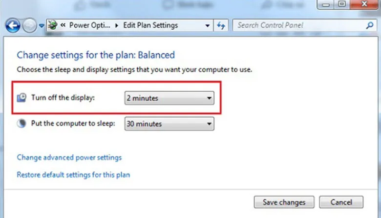 Các tùy chọn chi tiết điều chỉnh thời gian tắt màn hình laptop Windows 7 và 8