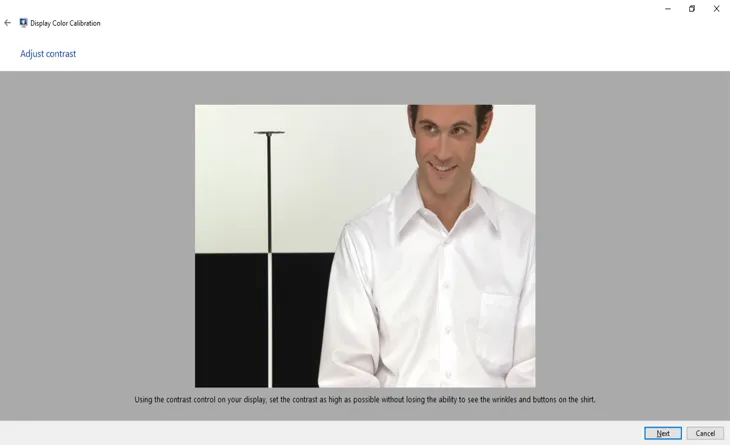 Tương tự, bước điều chỉnh độ tương phản (Adjust Contrast) đòi hỏi bạn tinh chỉnh bảng điều khiển để nhìn thấy các chi tiết trên áo sơ mi trắng. Hãy đảm bảo màu trắng sáng nhất vẫn giữ được chi tiết mà không bị cháy sáng (clipped).