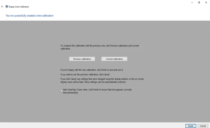 Đây là bước cuối cùng của việc cân chỉnh màu màn hình laptop. Bấm vào Previous calibration để xem lại