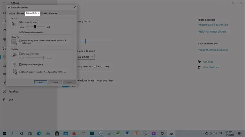 Mô tả cửa sổ Mouse Properties với tab Pointer Options được chọn