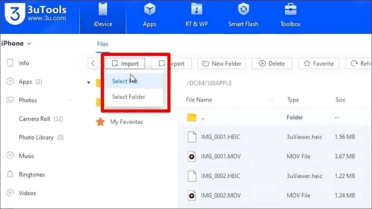 Bạn chọn các mục quản lý như “Apps,” “Photos,” hoặc “Music.” Sau đó, bạn sử dụng chức năng “Import” để chọn file từ laptop. 3uTools sẽ tự động chuyển và sắp xếp file. Đây là cách chuyển file từ laptop sang iPhone hiệu quả cho người dùng Windows muốn tránh iTunes.