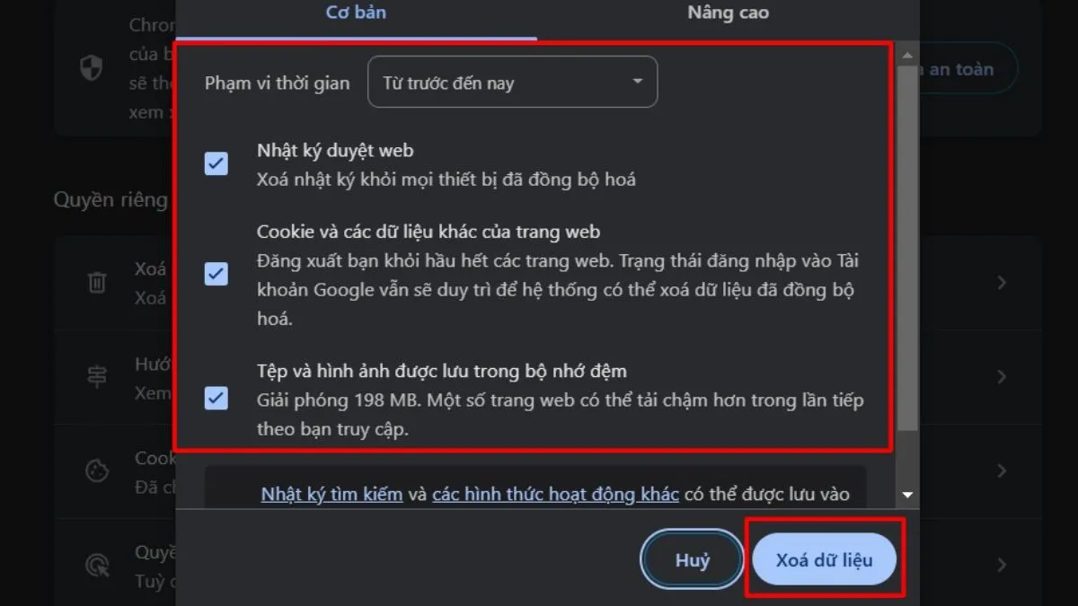 Trong cửa sổ này, bạn cần chắc chắn đã chọn các mục sau: “Lịch sử duyệt web”, “Cookie và các dữ liệu trang web khác”, và “Hình ảnh và tệp được lưu trong bộ nhớ cache”. Hãy chọn khoảng thời gian xóa là “Từ trước đến nay” hoặc “Mọi lúc”.
