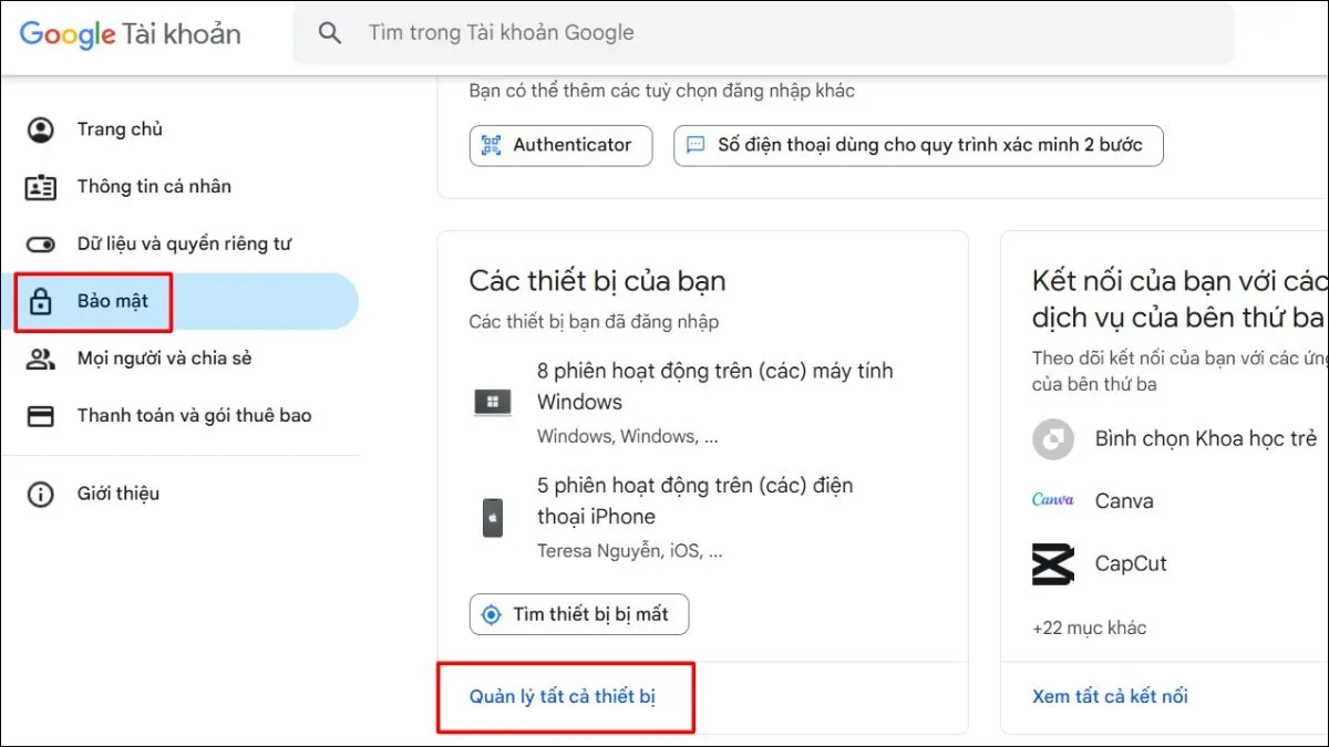 Hình ảnh minh họa vị trí tùy chọn "Quản lý tất cả các thiết bị" trong mục Bảo mật của Tài khoản Google.Hình ảnh minh họa vị trí tùy chọn "Quản lý tất cả các thiết bị" trong mục Bảo mật của Tài khoản Google.