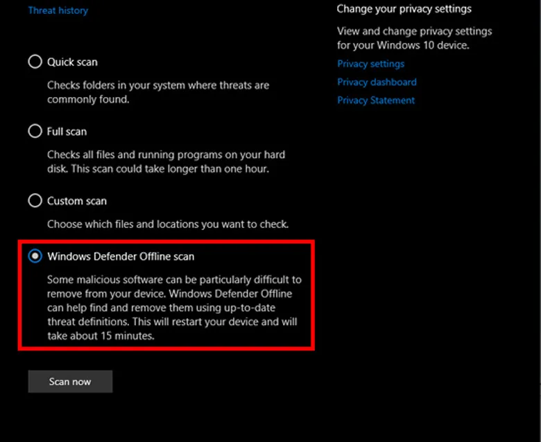 Tính năng Offline Scan sẽ khởi động lại máy tính vào một môi trường đáng tin cậy bên ngoài hệ điều hành Windows. Ở chế độ này, virus không thể hoạt động hoặc ẩn mình, giúp Windows Defender tiêu diệt chúng hiệu quả hơn.