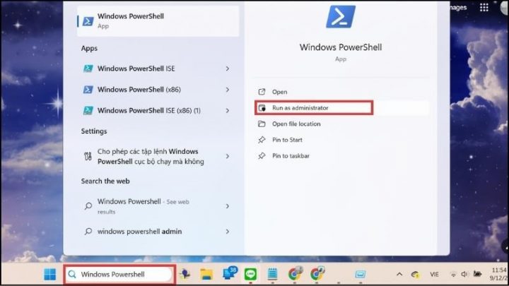Tìm kiếm powershell trong hộp tìm kiếm của Windows 11. Kích chuột phải vào “Windows PowerShell” và chọn “Run as Administrator” (Chạy với quyền Quản trị viên).