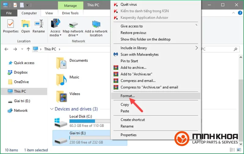 Mở This PC trên màn hình máy tính. Click chuột phải vào phân vùng ổ đĩa muốn format và chọn Format.