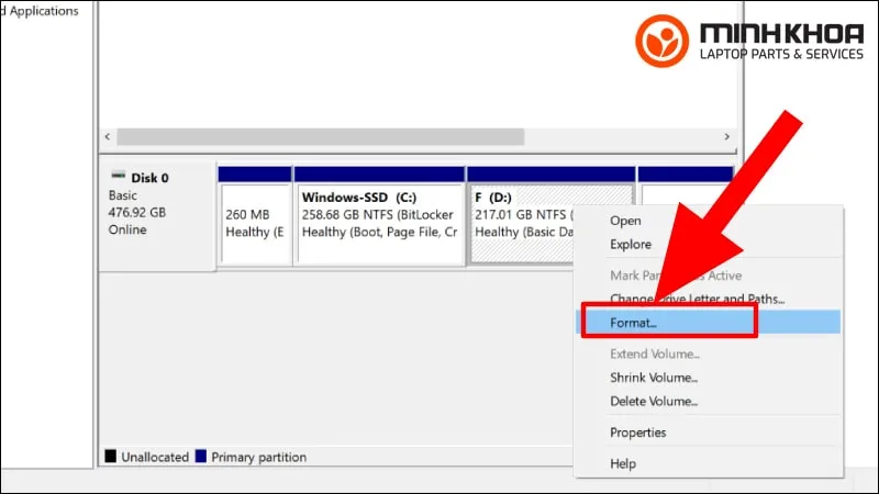 Chọn Format trong Disk Management để tiến hành định dạng ổ đĩa