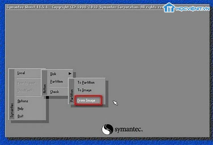 Sau khi Norton Ghost được khởi động, bạn sẽ đi đến tùy chọn Local > Partition > From Image. Tùy chọn này cho phép bạn bung file Ghost đã tạo sẵn (Image file) vào một phân vùng đích (Target Partition) trên ổ cứng laptop. Việc này chính thức bắt đầu quá trình phục hồi hệ thống.