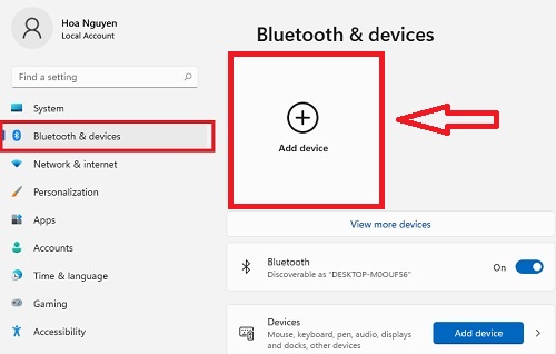 Trong mục “Bluetooth & devices”, người dùng nhấp vào “Add device” (Thêm thiết bị). Một cửa sổ mới sẽ hiện ra với ba tùy chọn. Chọn tùy chọn đầu tiên là “Bluetooth” (Chuột, bàn phím, bút, hoặc các loại thiết bị Bluetooth khác).