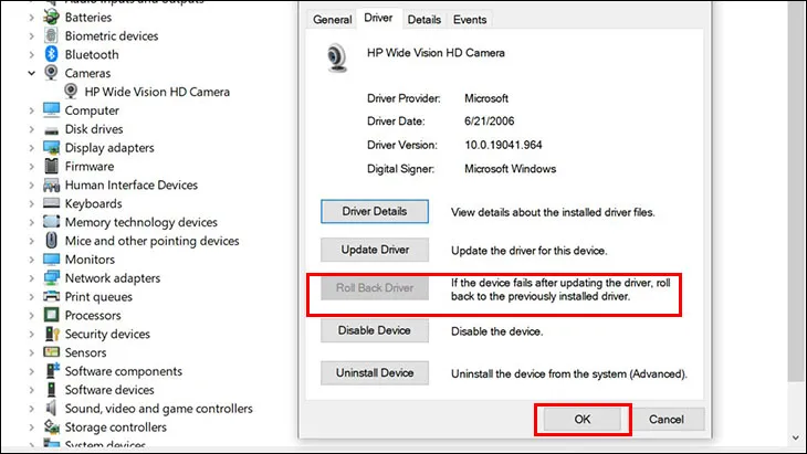Trong Device Manager, nhấp đúp vào driver camera, chọn tab Driver. Nếu nút Roll Back Driver có thể nhấp được (không bị mờ), hãy chọn nó và làm theo hướng dẫn.