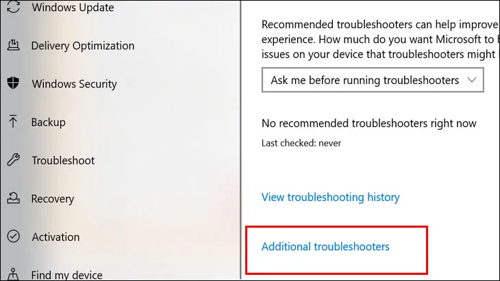 Chọn Additional Troubleshooters trong cửa sổ cài đặt