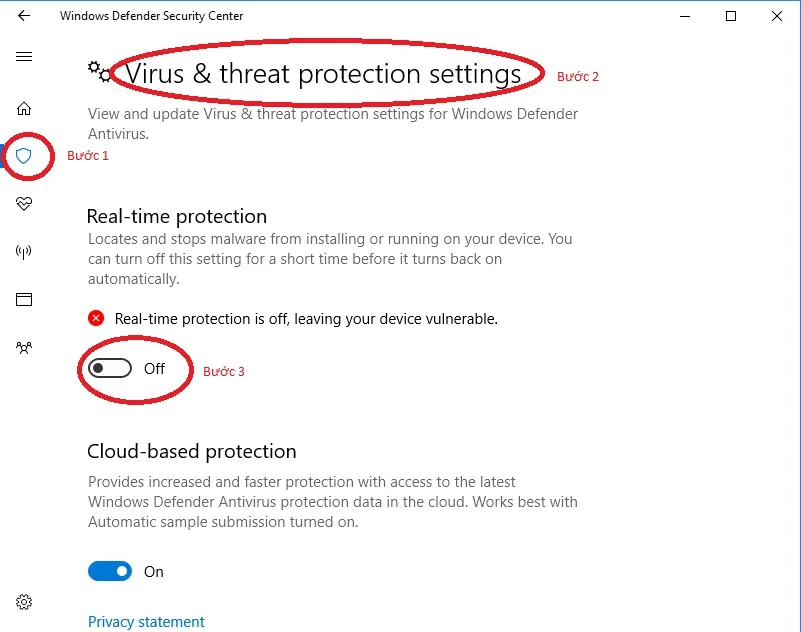 Tắt Real-time protection của Windows Defender để kiểm tra xung đột