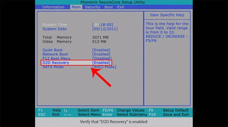 Sau đó, hãy đảm bảo tùy chọn D2D Recovery hoặc F9 Factory Reset được đặt thành Enabled. Tùy chọn này cho phép hệ thống truy cập vào phân vùng khôi phục.