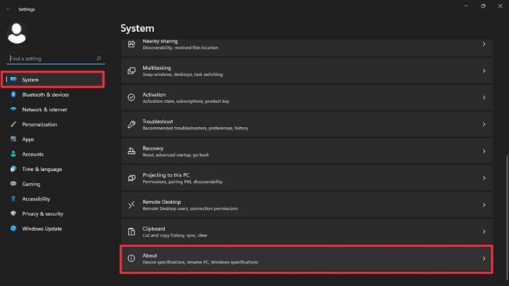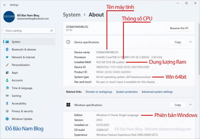 Để thực hiện, bạn nhấn tổ hợp phím Windows + I để mở nhanh ứng dụng Settings. Trong cửa sổ Settings, chọn mục System (Hệ thống) ở cột bên trái, sau đó cuộn xuống và chọn About (Giới thiệu). Màn hình About sẽ hiển thị hai phần thông tin chính: Device specifications (Thông số kỹ thuật thiết bị) và Windows specifications (Thông số kỹ thuật Windows).