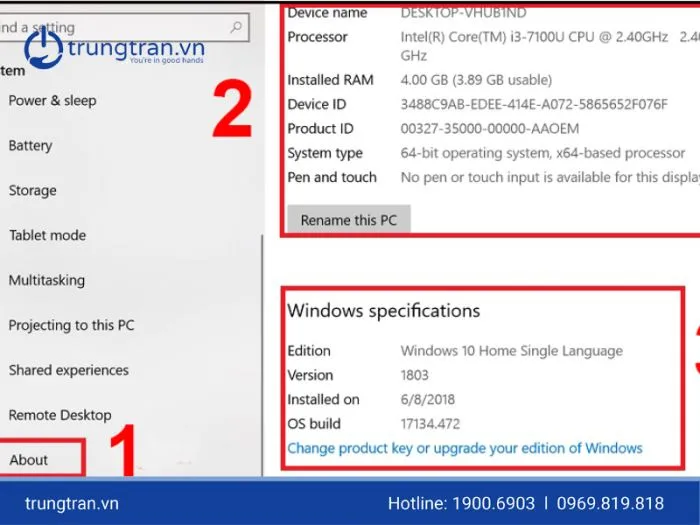 Mở Settings, chọn mục System, sau đó cuộn xuống và chọn About. Màn hình sẽ hiển thị tóm tắt về tên thiết bị, loại vi xử lý và thông tin RAM. Phương pháp này rất nhanh chóng nhưng chỉ cung cấp các thông số cốt lõi, ít chi tiết kỹ thuật chuyên sâu. Tuy nhiên, nó đủ để xác định model máy và phiên bản Windows, phục vụ các nhu cầu kiểm tra nhanh hàng ngày.